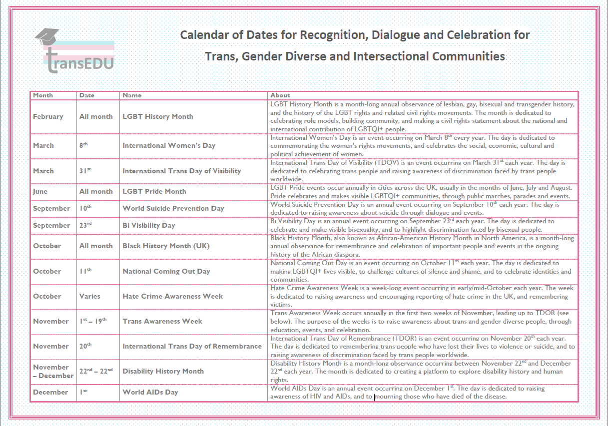 There are a number of key dates and observances throughout the year which may form valuable opportunities to increase dialogue and awareness around diverse trans communities in your institution. Click here to view and download our Calendar of Key Dates for recognition, dialogue and celebration for trans, gender diverse and intersectional communities.